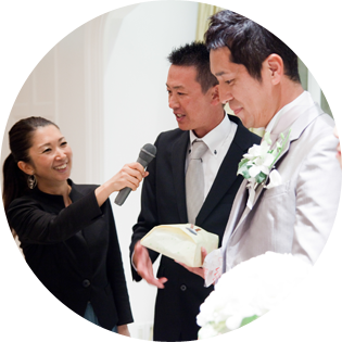 | 経験豊富な司会者が、技術とノウハウを活かし、新郎新婦の思いをカタチにします。 お二人のご希望やご意見を伺いながら、お二人のイメージに合ったパーティを、 そして、お二人の大切なゲストの皆様が喜んでくださる進行・演出を提案してまいります。 一生に一度のことだからこそ、ゲストの皆さまへ感謝の気持ちを伝えつつ、 お二人らしいこだわりのパーティを実現しましょう。 |