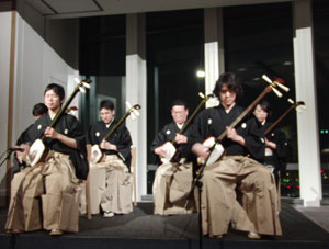 津軽三味線は、小山流家元・小山貢新主宰 津軽三味線連奏集団・響絃(きょうげん)。 合奏演奏を得意とし津軽三味線伝統曲をソロ演奏から乱れ引き、数人から数十人の演奏により豪放・繊細・重厚な迫力と奥深い多彩なハーモニーを醸し出します。 その他、木遣り、長持唄、琴など日本伝統の生演奏、日本ならではの演出でパーティを盛り上げます。
